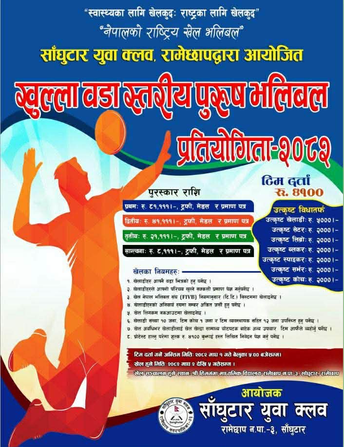 रामेछापको रामेछाप नगरपालिका वडा नं ३ साँघुटारमा खुल्ला वडा स्तरिय पुरुष भलिबल प्रतियोगिता हुने भएको छ । साँघुटार युवा क्लबको आयोजनामा प्रतियोगिता हुन लागेको हो ।